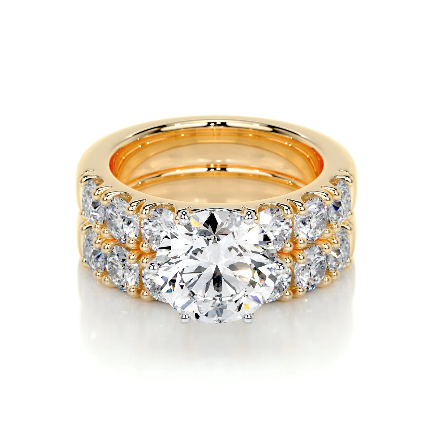 Diamonds: The main stone in picture is a 3 Carat E VS1 Round diamond; the side diamonds have total 3 Carat diamonds