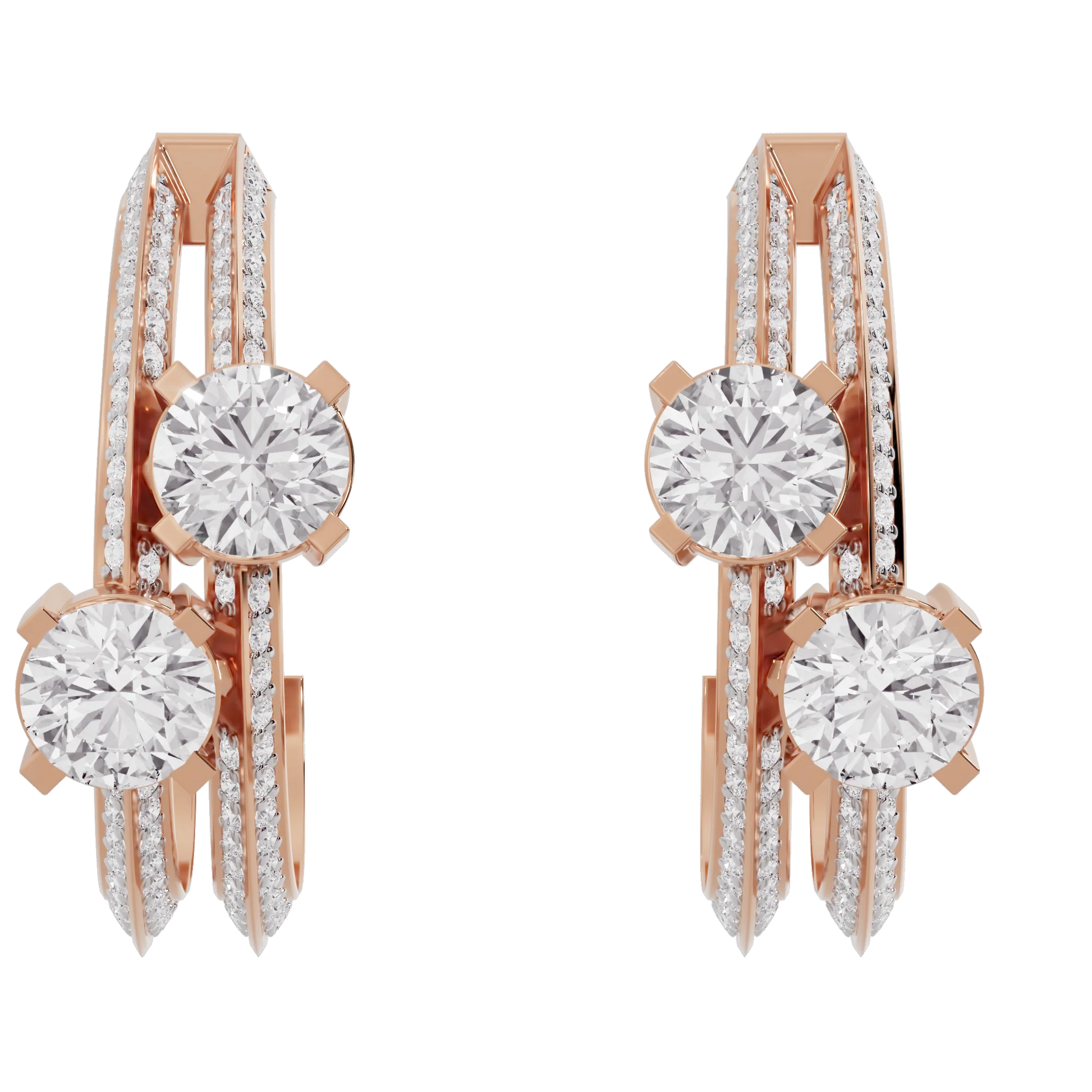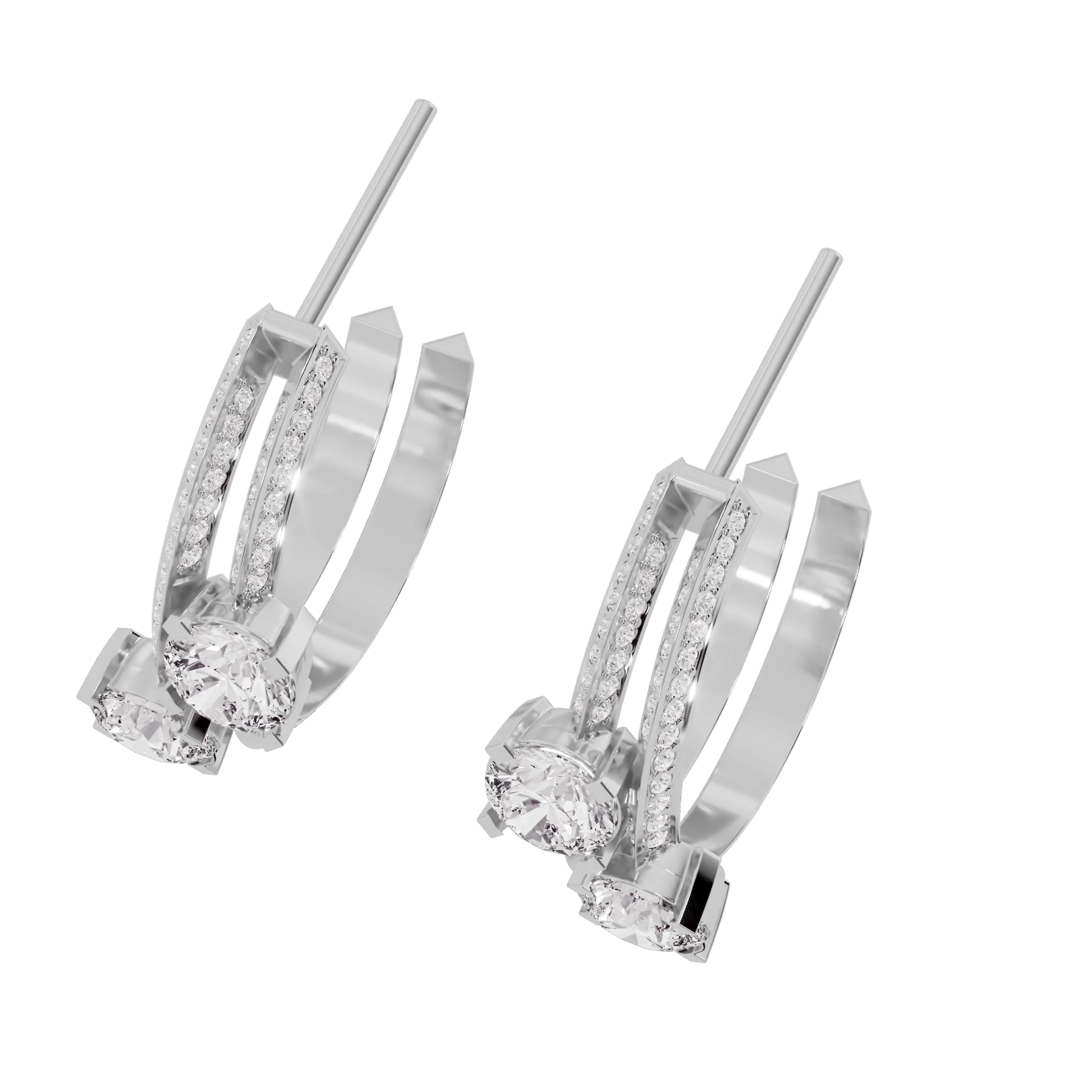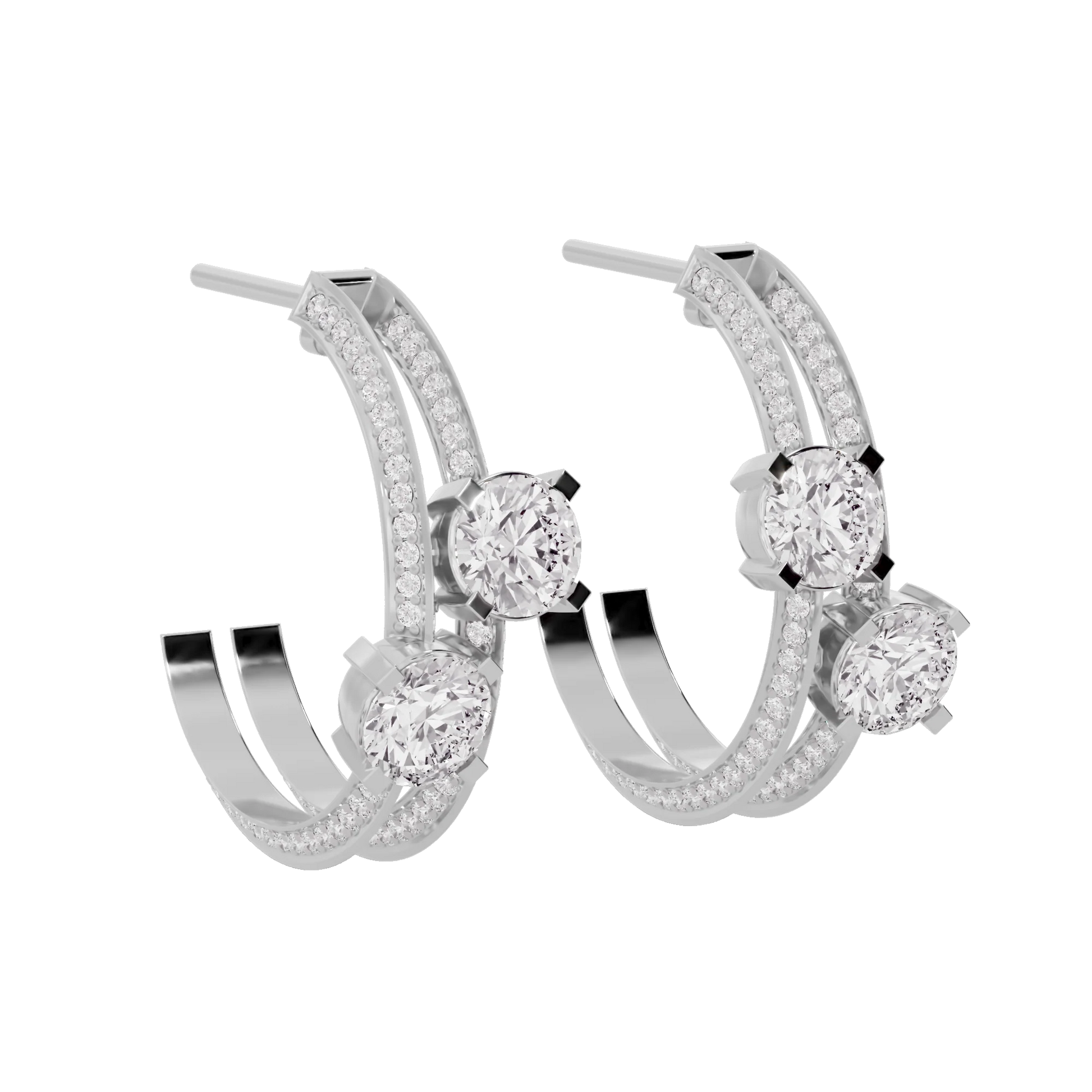 Earrings Style: Hoop style earrings with round shaped solitaire diamonds and side stones.