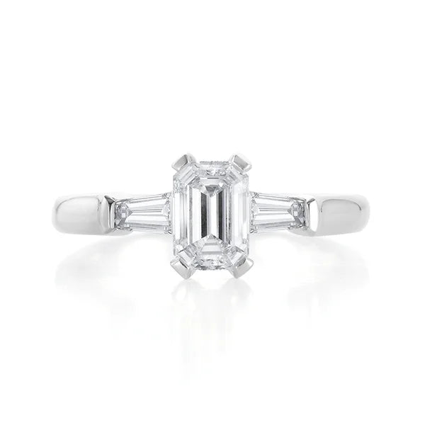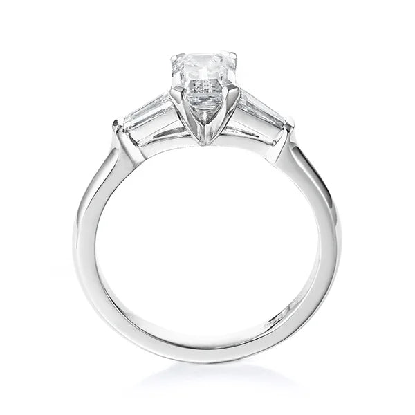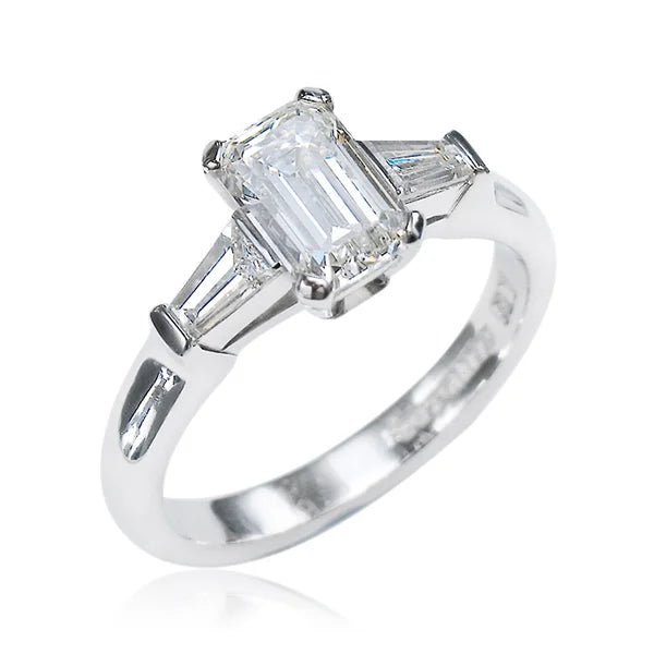 Diamonds: The main stone in picture is a 1 Carat E VVS2 Round/ Emerald diamond; the Sides are approx 1 Carat baguette diamonds