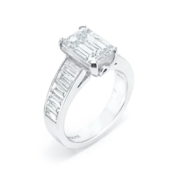 Diamonds: The main stone in picture is a 3 Carat E VVS2 Emerald diamond; the Sides are approx 1 Carat baguette diamonds