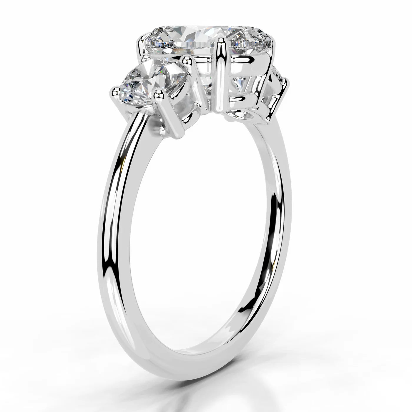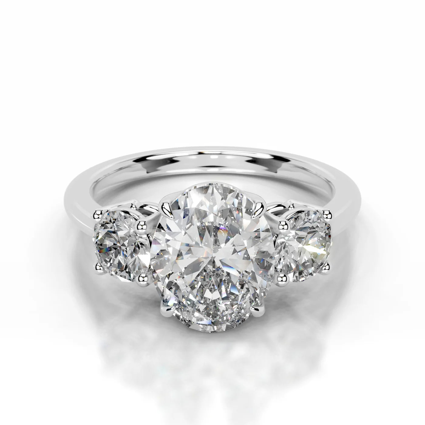 Diamonds: The picture has main stone of 1 Carat VS1 Oval diamond; the sides are 0.50 Carat round diamonds on each side