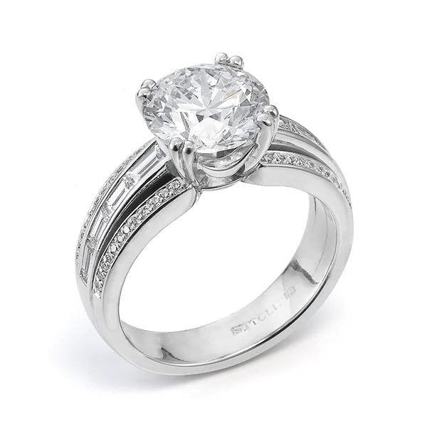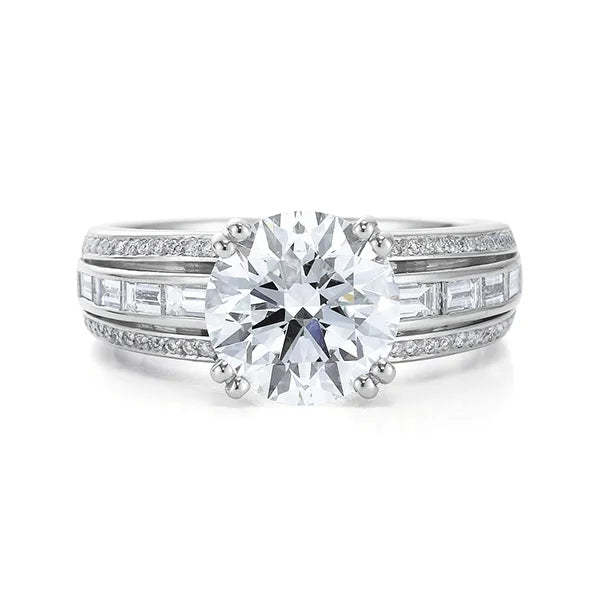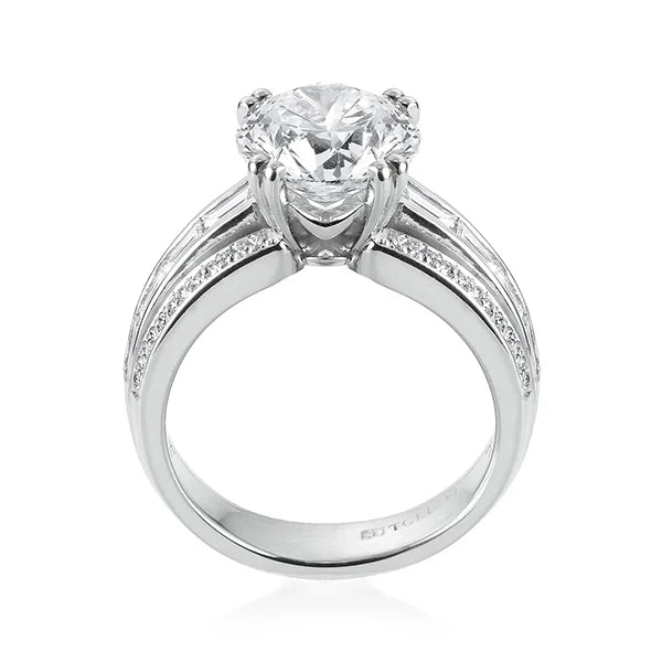 Handcrafted in 14K gold, this masterpiece is crowned with a breathtaking 3-carat diamond solitaire, beautifully complemented by baguette and round brilliant accent diamonds that add extra sparkle from every angle. A timeless design that turns a proposal into a fairytale.