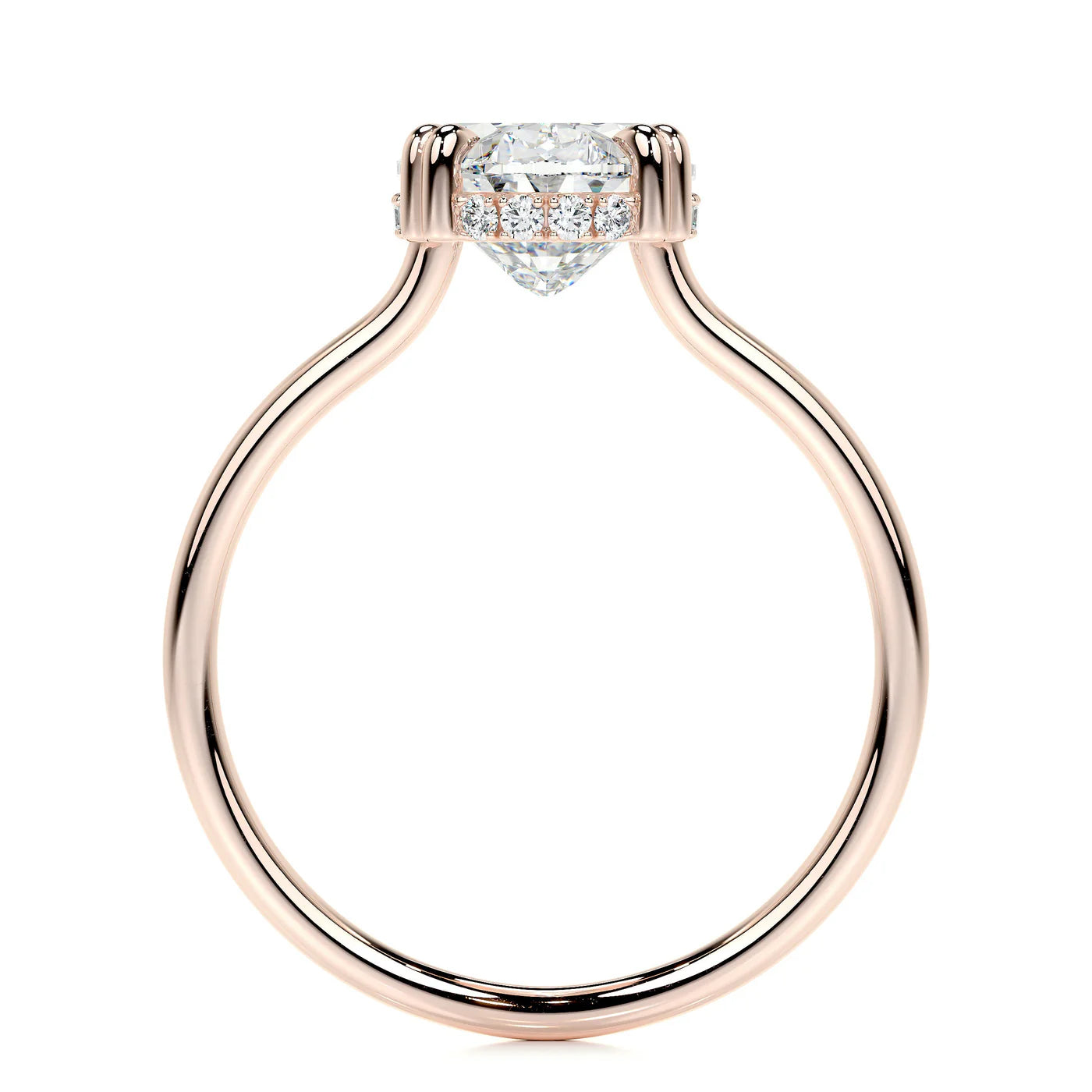Band thickness is 1.4mm. The design's look is elevated with the thin band & hidden halo of 0.1 carat small diamonds, allowing the stone to stand out.