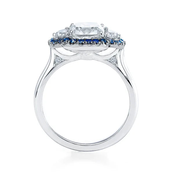 At its heart lies a 1.52-carat cushion-cut diamond, flanked by half-moon diamonds and framed with a halo of vivid blue sapphires. The white gold band enhances the brilliance of the diamonds while allowing the sapphires’ rich hues to shimmer like deep alpine waters. A design that captures both heritage and romance, this ring is as breathtaking as the landscapes it’s inspired by.